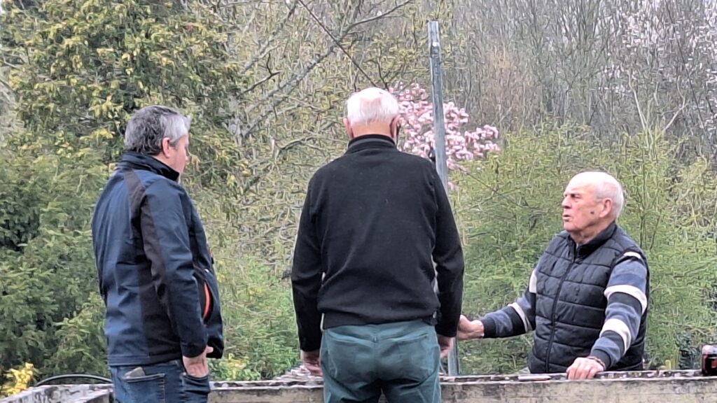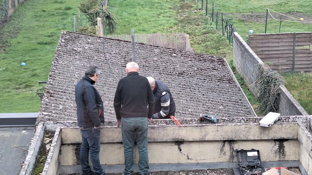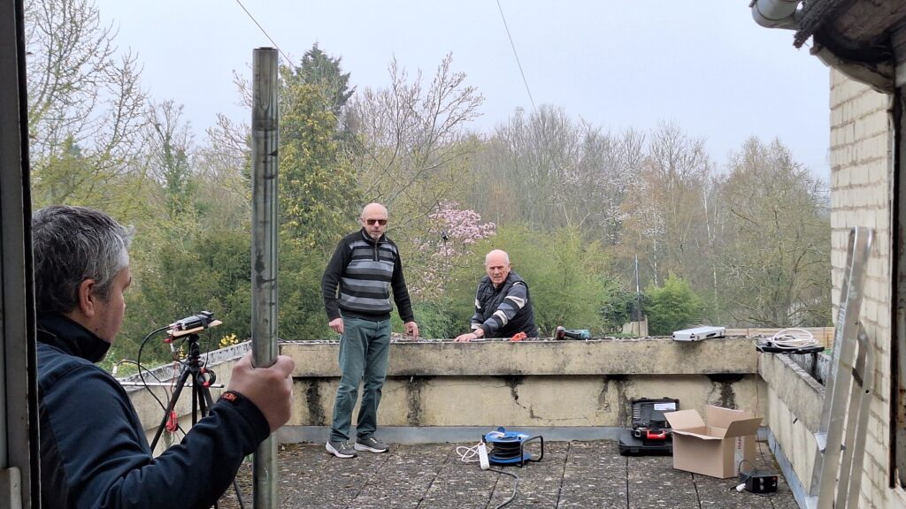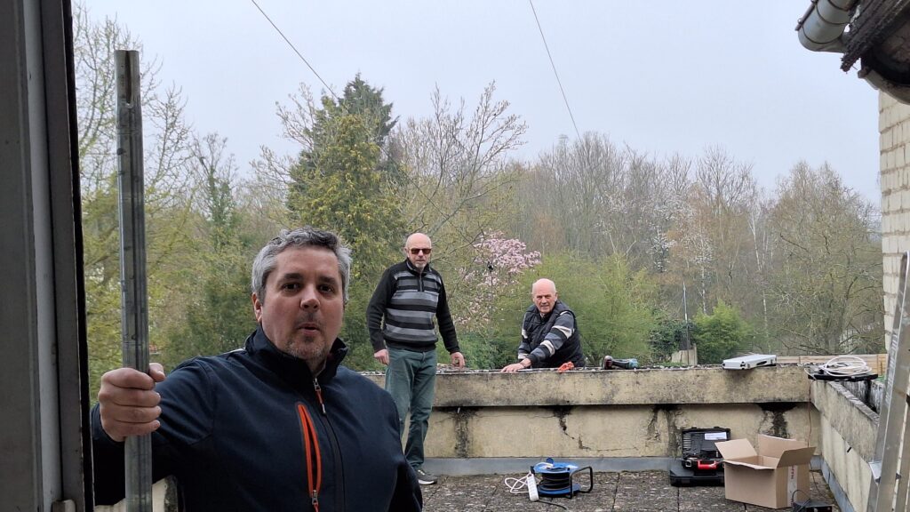 JR de F5HKV, éternel casse-cou (non mais sans blague, il est posé sur un toit en pente) commence la fixation du mat de l’antenne parabole…